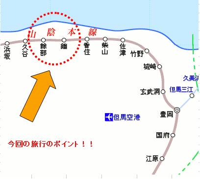 鉄道紀行作家の宮脇俊三さんは山陰本線(特に城崎−島取間)を「山陰の景観の白眉」と評してこよなく愛していました。宮脇さんがこの景観(特に余部鉄橋が好きだったようですが。)を好んでよく行っていた事はこのページのコーナーを作った後に始めて知りましたが、僕自身はたまたま鳥取旅行に行く途中でみた、この景観に心を打たれたのがこの山陰本線との出会いでしたが、このような作家の方が深く愛した区間と僕も関西にいる間に巡り合えたことはすごく幸せだったなと思えます。 |